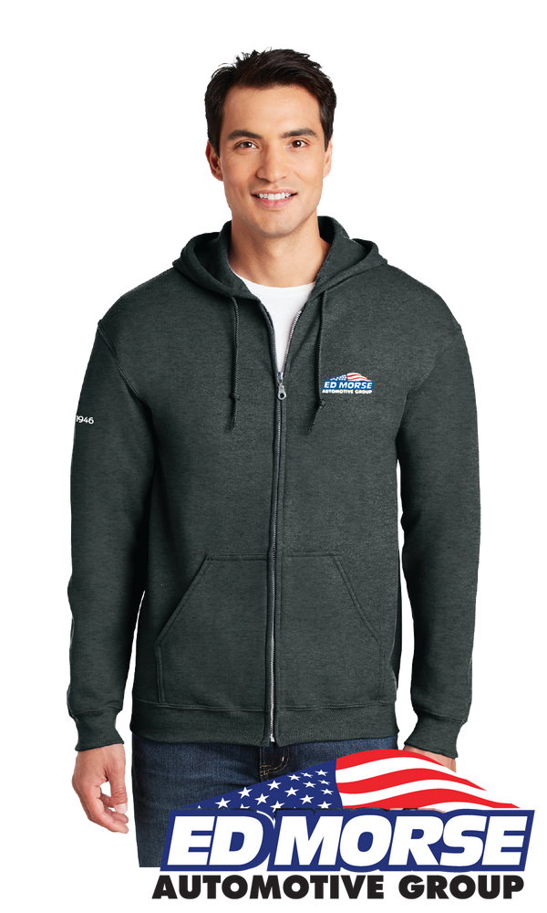 8-ounce, 50/50 cotton/poly NuBlend pill-resistant fleece. Single-ply hood with tipped and knotted drawcord. Aluminum zipper. Front pouch pockets.